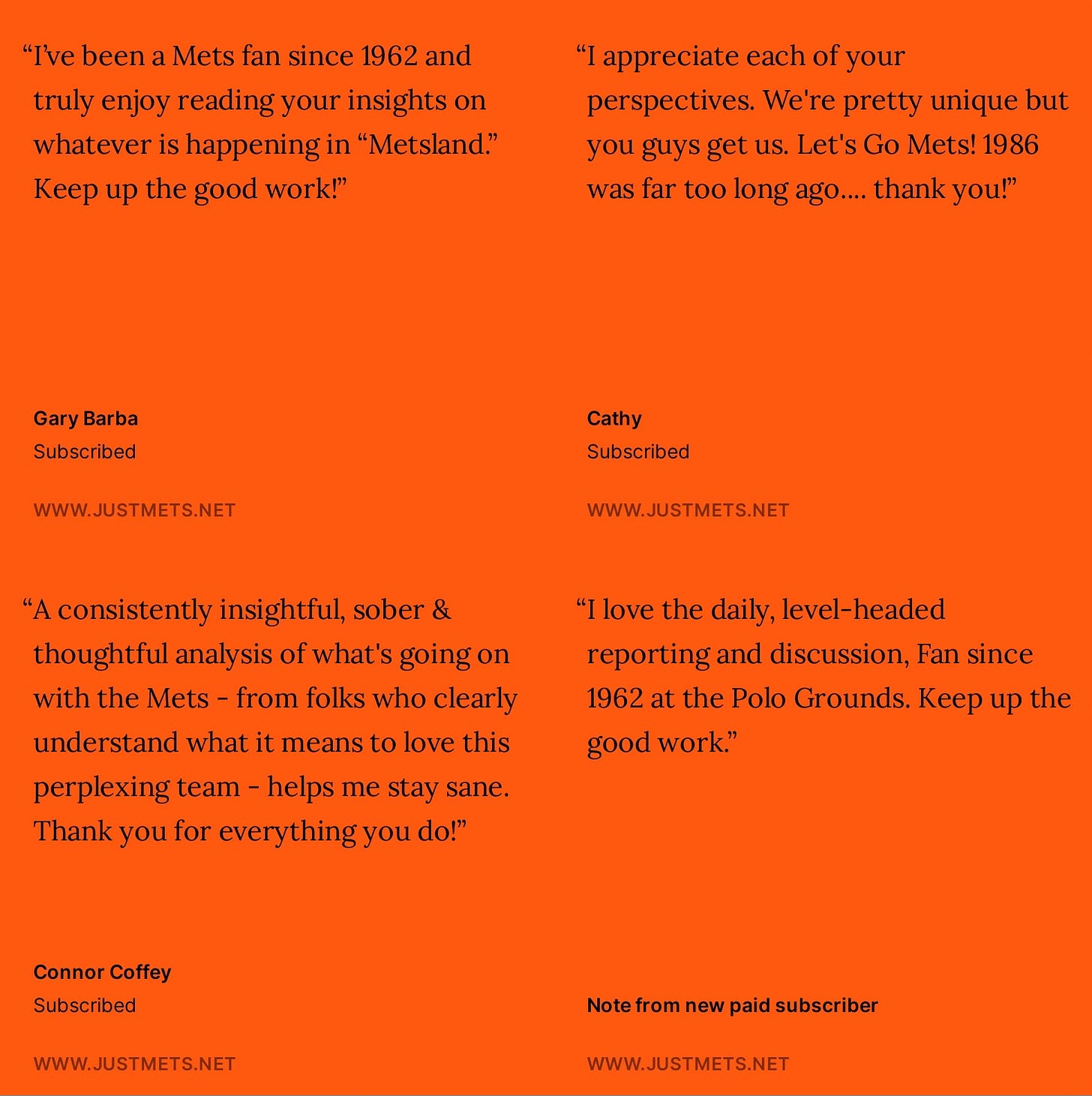 Just Mets is a rebirth of some old school Mets blogging. This is the place for news, insight, analysis, with some ranting and raving about the New York Mets. But we are going to modernize the platform to create exclusive, cant-miss subscription-based content. We want you to use Just Mets as a one-stop-shop for Mets content where you can find out what’s going on quickly and easily.