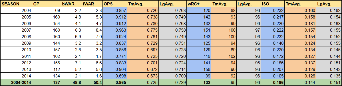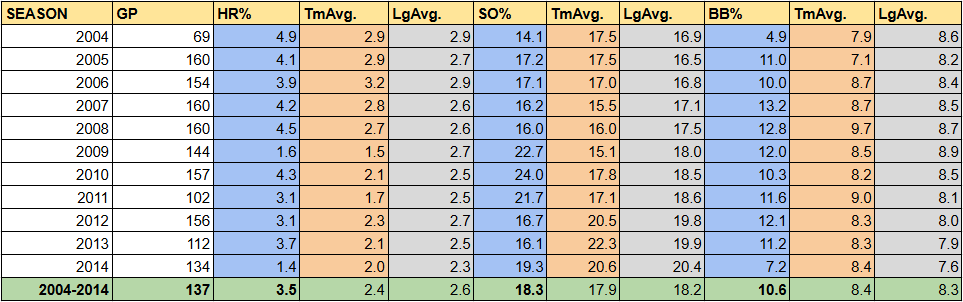 So, I made another sheet, this time comparing his HR%, K%, and BB% from 2004-2014 with the team and league rates for each respective season.