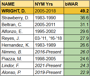 It’s forgivable. He gave us a lot to talk about. In addition to seven All-Star appearances, two Gold Gloves, and two Silver Sluggers, Wright is also the franchise leader in: