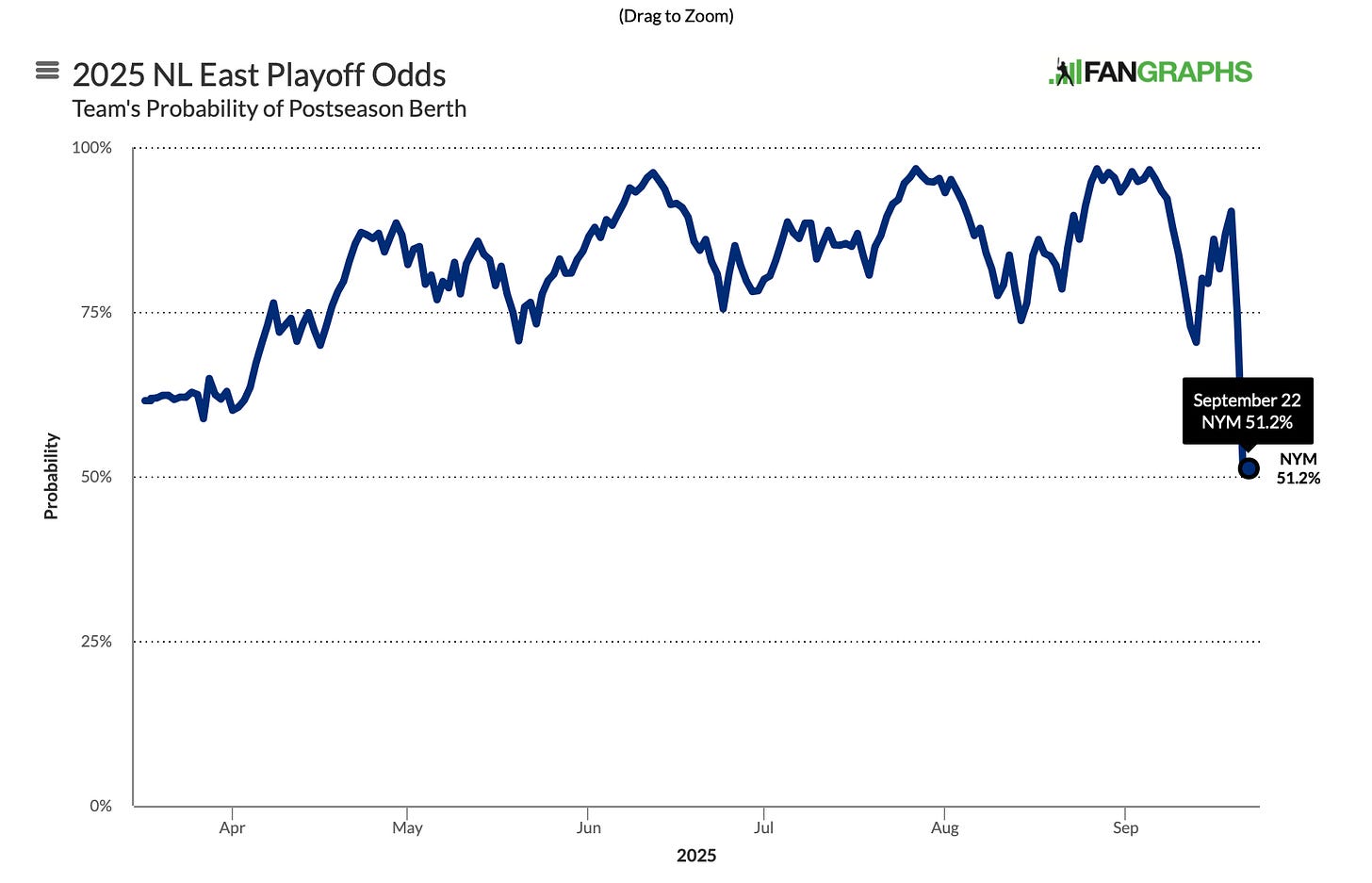 Per Fangraphs, the Mets’ 2025 playoff odds have dropped sharply to just 51.2%, down from 75.9% the day before. It’s their lowest statistical odds of making the playoffs this season.
