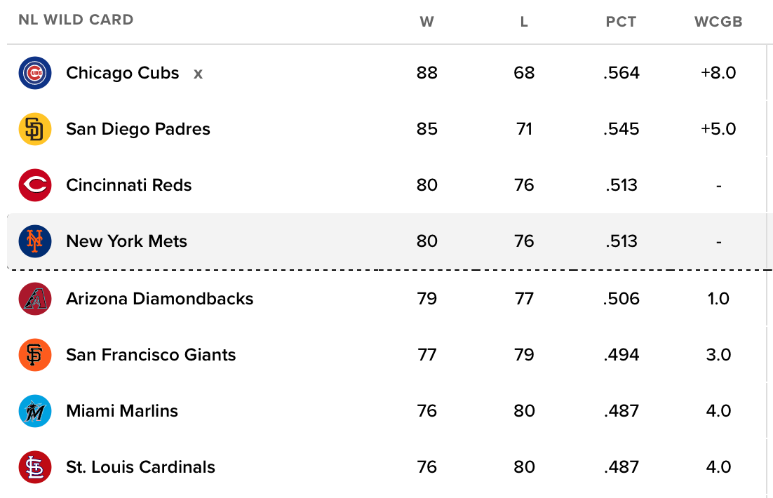 The Reds swept their series against the Cubs, the Diamondbacks blew out the Phillies, and the Giants beat the Dodgers all after the Mets suffered what was already a damaging loss to the Nationals on Sunday. The Reds now have an identical record to the Mets, while the Diamondbacks sit just one game behind both in the wild card race.