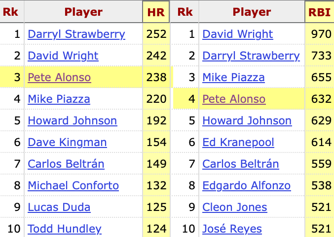 With his three-run home run on Sunday, Pete Alonso now has 238 career home runs, four behind David Wright for second place in franchise history and 14 behind Darryl Strawberry for the all-time franchise mark.