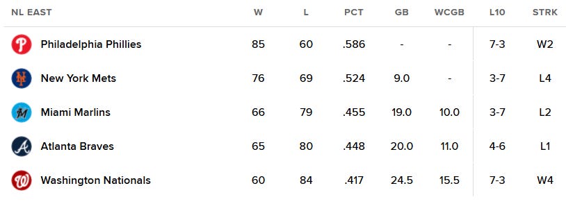 Any hopes for a late push to capture the NL East crown are all but dead as the Mets now sit nine games behind the Philles with 17 games left to play: