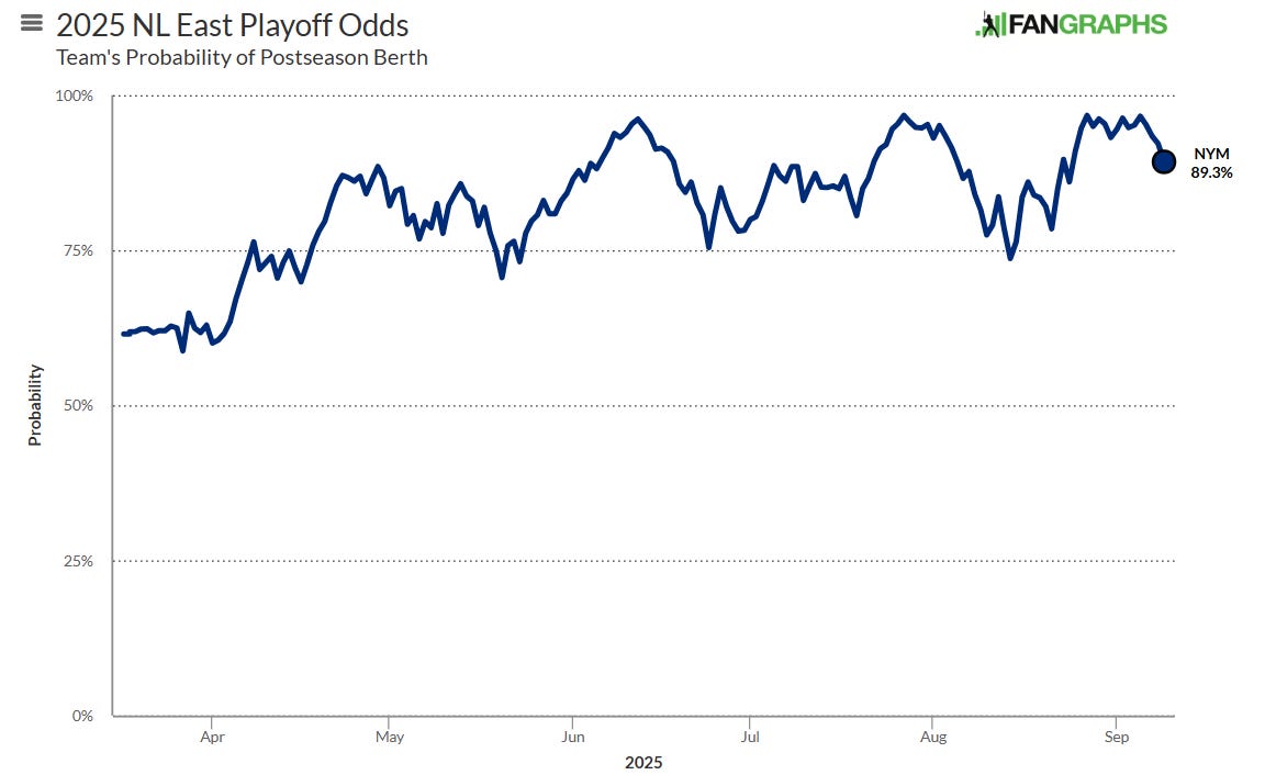Per Fangraphs, the Mets now have just an 89.3% chance of making the 2025 playoffs.
