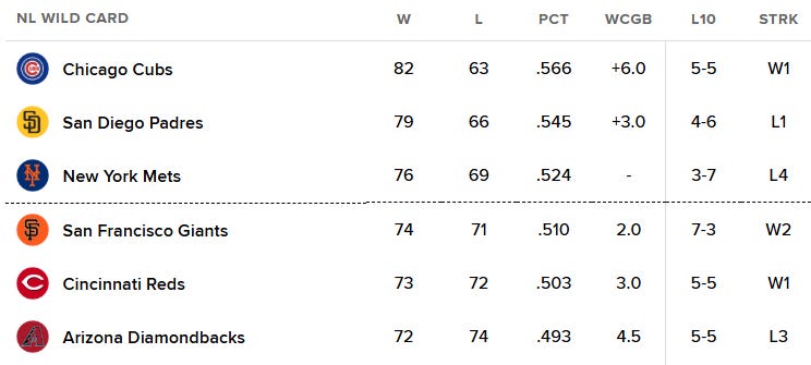 Unfortunately, though the Cardinals lost again, both the Reds and the Giants won their games yesterday, reducing the Mets’ hold on the final Wild Card spot to a measly two games: