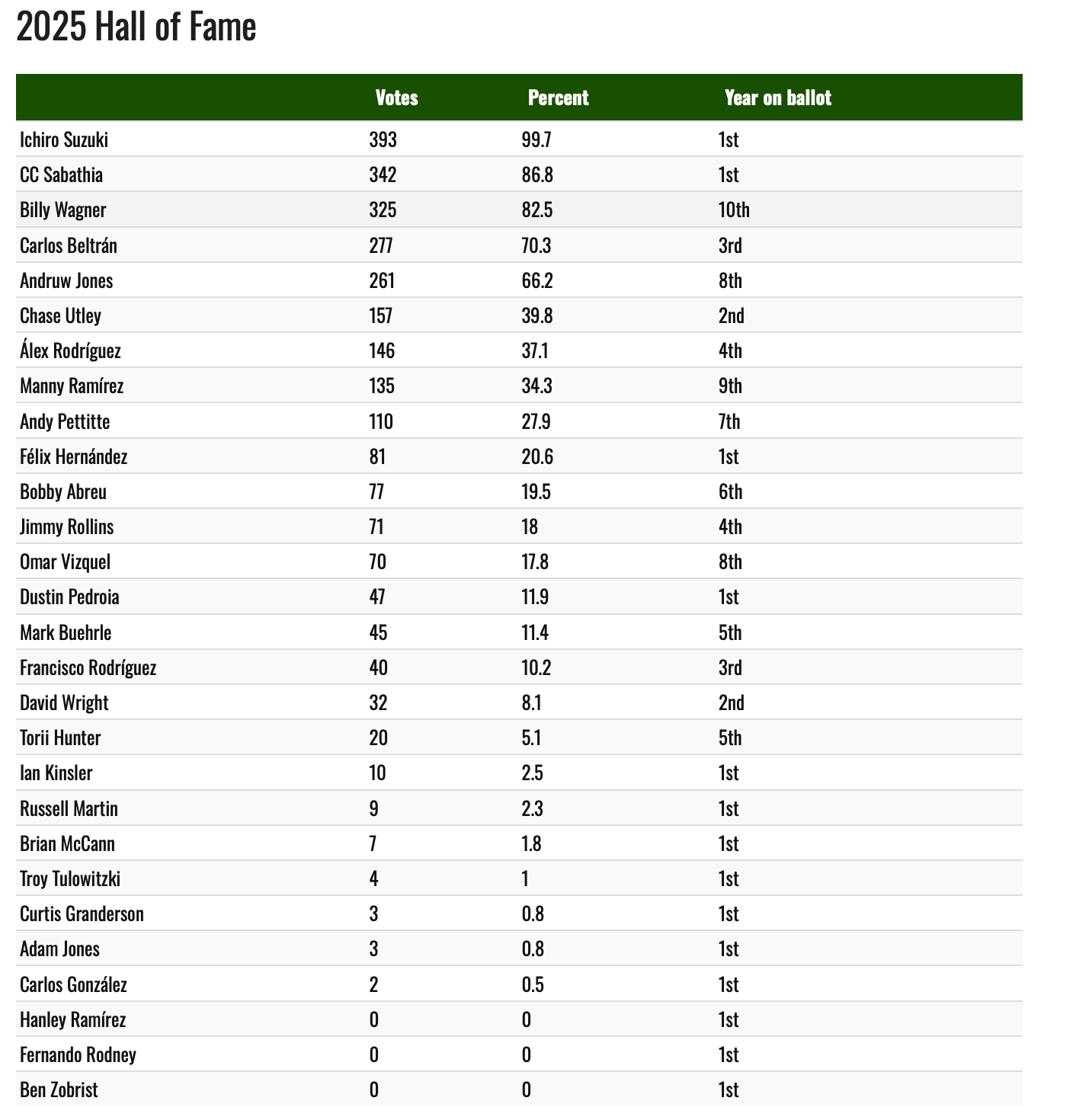 Meanwhile, Carlos Beltrán appeared on 70.3 percent of the ballots, about five percent short of the needed number for induction. David Wright received 8.1 percent of the vote.