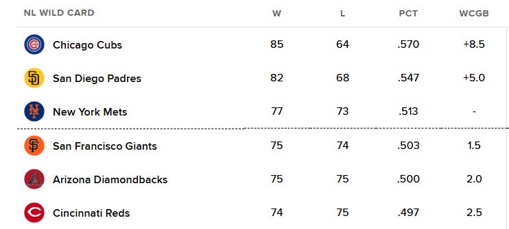Heading into play this week the Mets are 1.5 games clear of the rest of the field in the race for the final Wild Card spot.