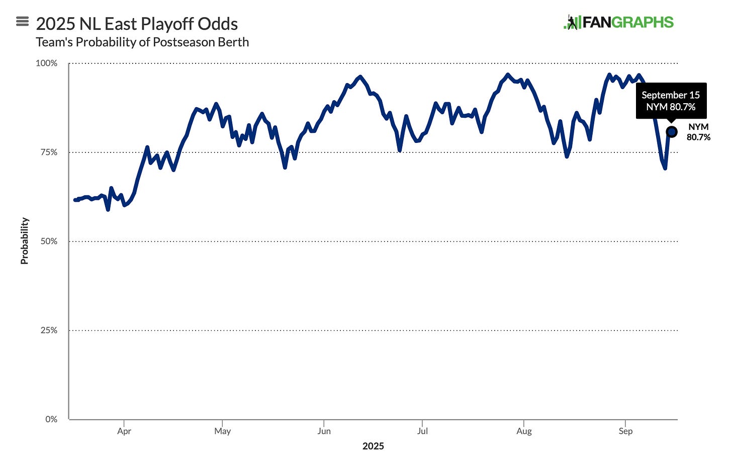 Per Fangraphs, the Mets have an 80.7% chance of qualifying for the postseason.
