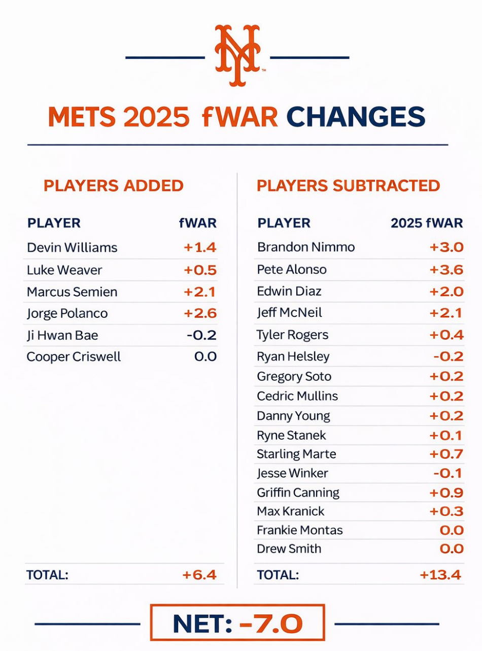 Three weeks ago, there was a lot of time left before the start of Spring Training. But the Mets have only dug their hole deeper with the trade of Jeff McNeil with next to no response, and now there are just about six weeks before pitchers and catchers report to Port St. Lucie. Sure, there are a lot of free agents available; they can definitely swing a big trade, but the Mets have to cover a 7 fWAR deficit that they’ve created just to be as bad as they were in 2025, as of right now anyway.