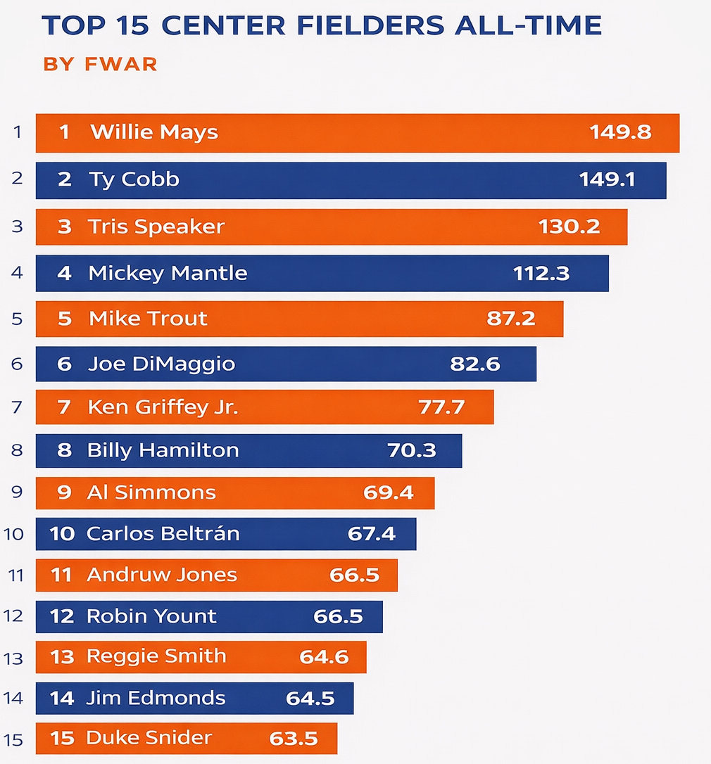 His 67.4 fWAR is 10th best all-time among qualified centerfielders. His 565 doubles are fourth all-time, and his 435 home runs are fifth all-time.