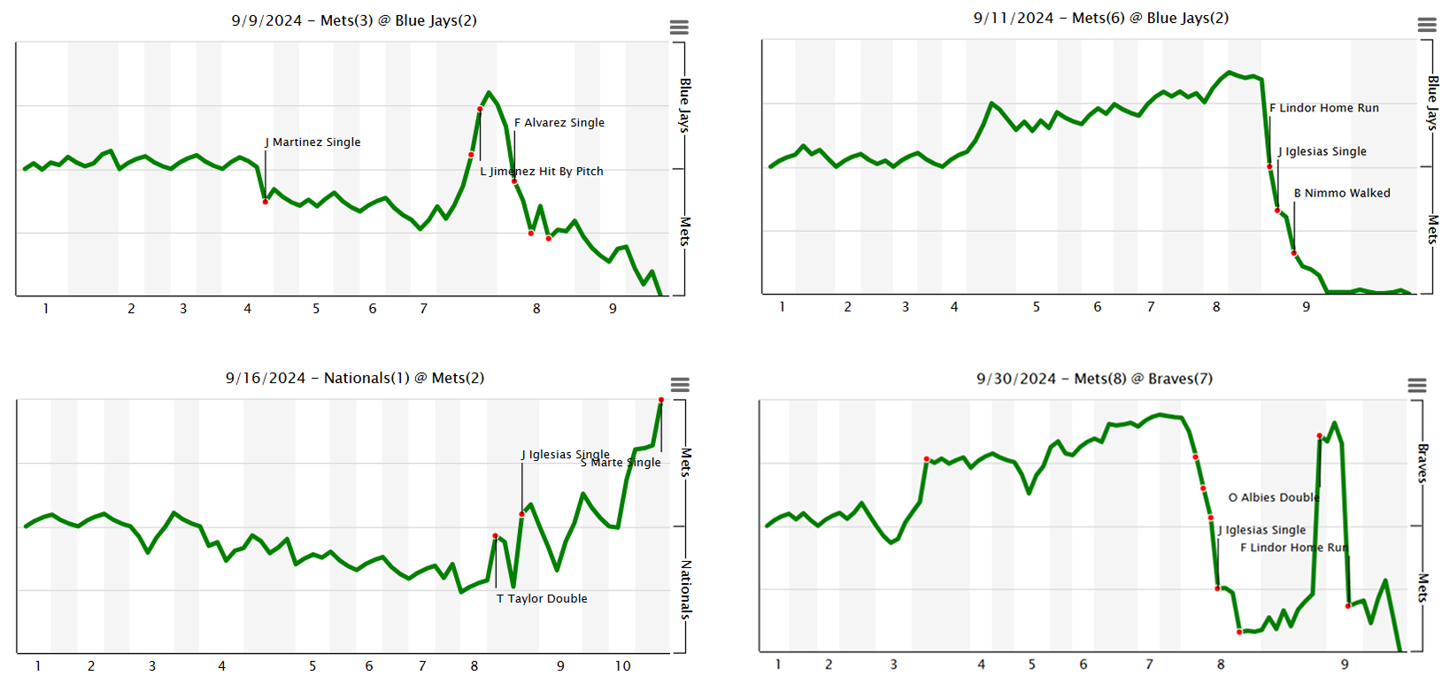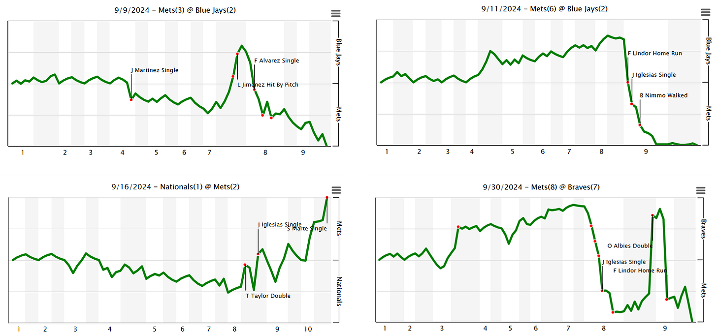 Last September, there were four games whose win probability swings resembled those of last night’s. Though not all perfect parallels (except that famous Braves game), each of the four games identified features some noteworthy commonalities with last night’s performance: