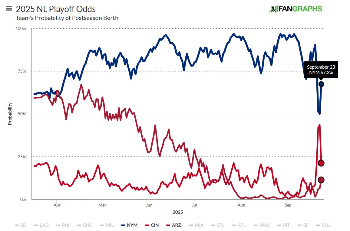 Per FanGraphs, the Mets are back up to a 67.3% chance of making it to the playoffs; the Reds’ odds have plummeted to just north of 20%, while Arizona lingers at 6%.