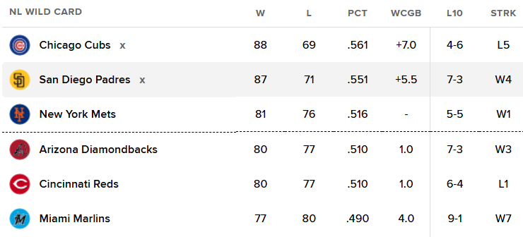With their win and the Reds’ loss yesterday, the Mets are back in control of the third Wild Card spot, although the Diamondbacks maintained their pace and sit a game behind the Mets, as do the Reds with five games to go: