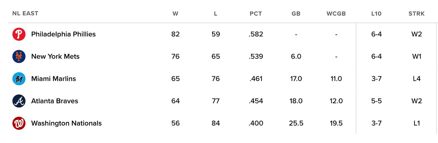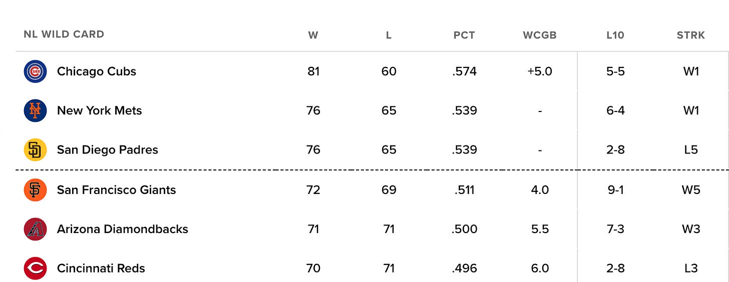 Elsewhere, the Giants won again and are now four games back of New York (five by virtue of the tiebreaker) and San Diego for the final two Wild Card berths, while the Diamondbacks won to move ahead of the Reds. The Mets magic number over the Giants is 17, and 16 over both the Diamondbacks and Reds with 21 games to go: