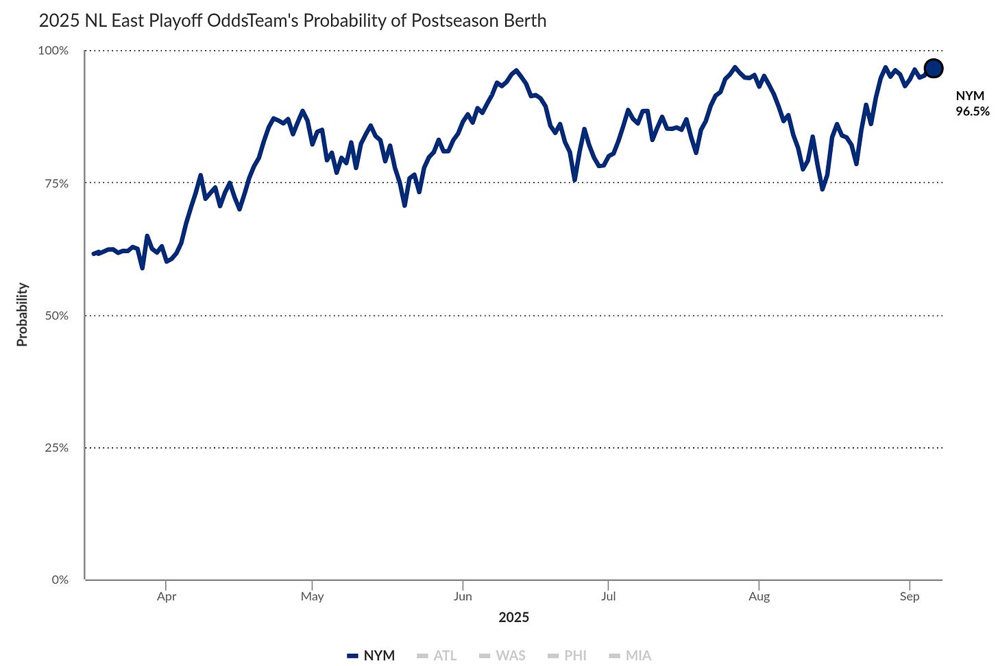 Per FanGraphs, the Mets have a 96.5% chance of making the 2025 postseason.