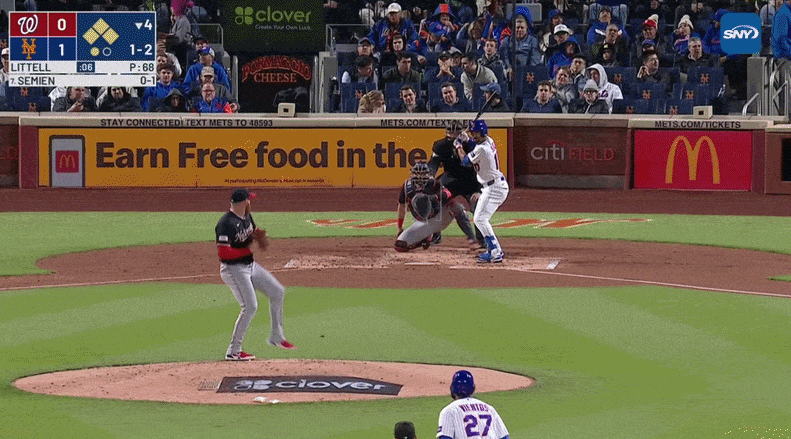 Staring down a 1-2 count, Semien slapped a splitter from Littell straight at Nats third baseman Jorbit Vivas’s glove — but then Jorbit Vivas turned into Jorbit Buckner. Vivas misplayed the ball on the hop, letting it slip under his glove and slide into left field. Two runs scored, with five more to follow in the inning off the bats of Benge, Bichette, and Soto.