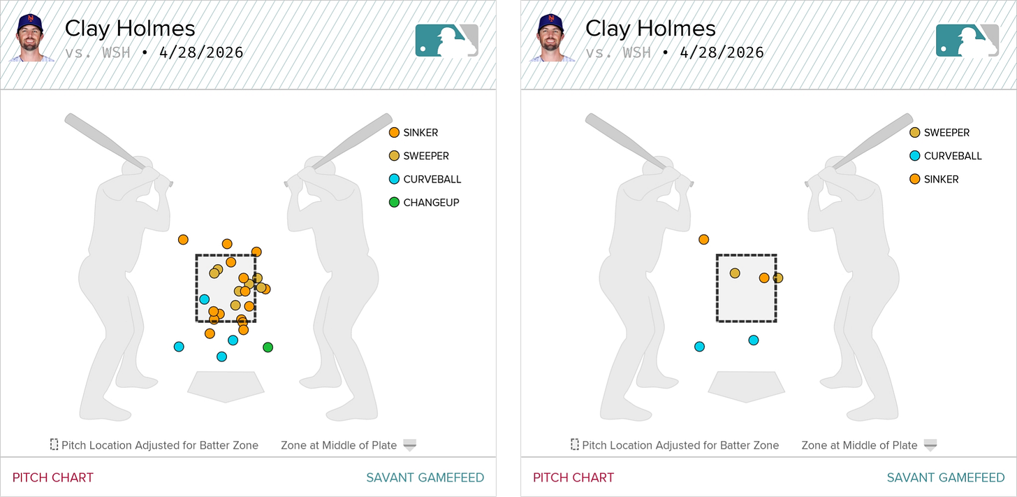 Holmes attacked the zone with his entire repertoire, finishing his night with a 68% strike rate over 94 pitches. Save for two wayward cutters, he threw all of his shapes for strikes regularly, with his sinker, sweeper, and curveball each eliciting a 70% rate. Just about everything was working the way he wanted, and he was able to get strikeouts both in and out of the zone with equal frequency as a result.