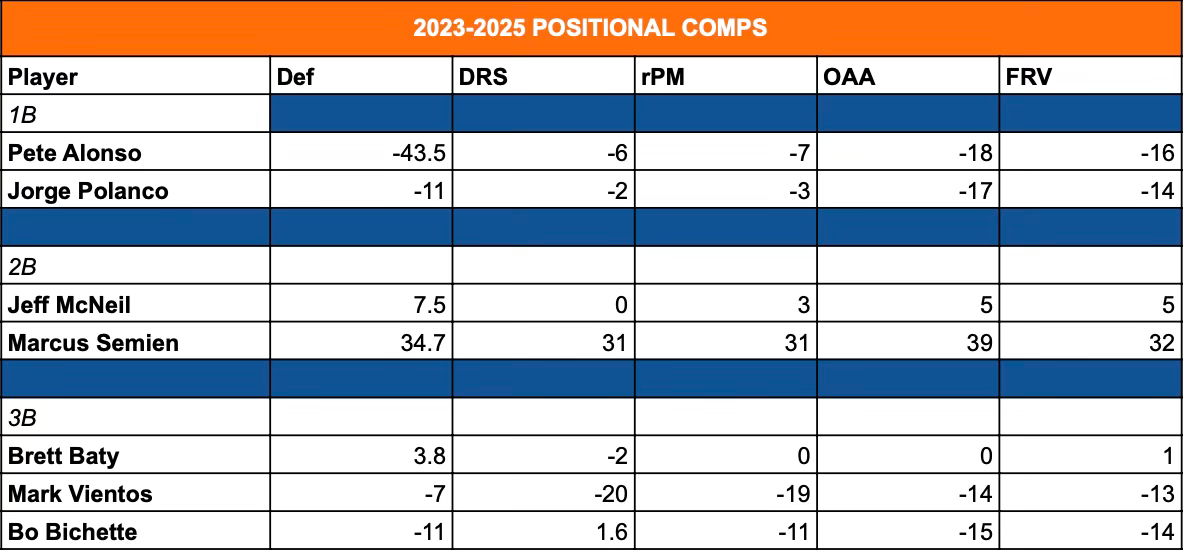 So, picking up where the 2022 article left off, I pulled together a quick chart comparing the defensive performance of current and past Mets infielders from 2023-2025. I decided to look at five stats: Defensive Runs Saved (DRS), Plus/Minus Runs Saved Above Average (rPM), Outs Above Average (OAA), Fielding Run Value (FRV), and FanGraphs’ Def.
