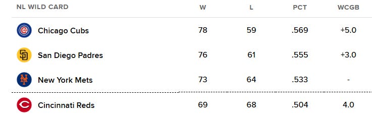 Meanwhile, the Reds beat the Cardinals and pulled within four games of the Mets in the Wild Card standings. The Mets magic number over the Reds is 22.