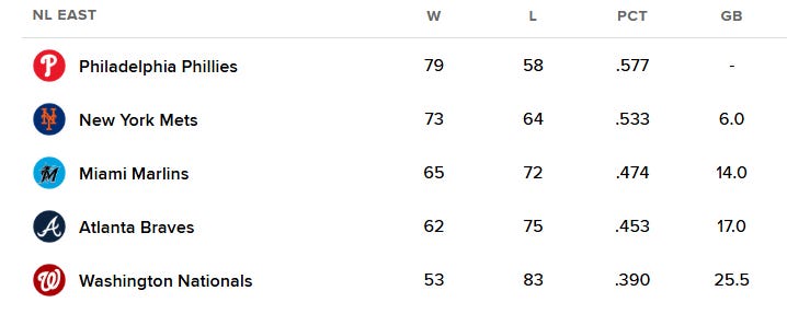 The Phillies finally lost a game to the Braves this weekend which means the Mets will say six games back in the NL East.