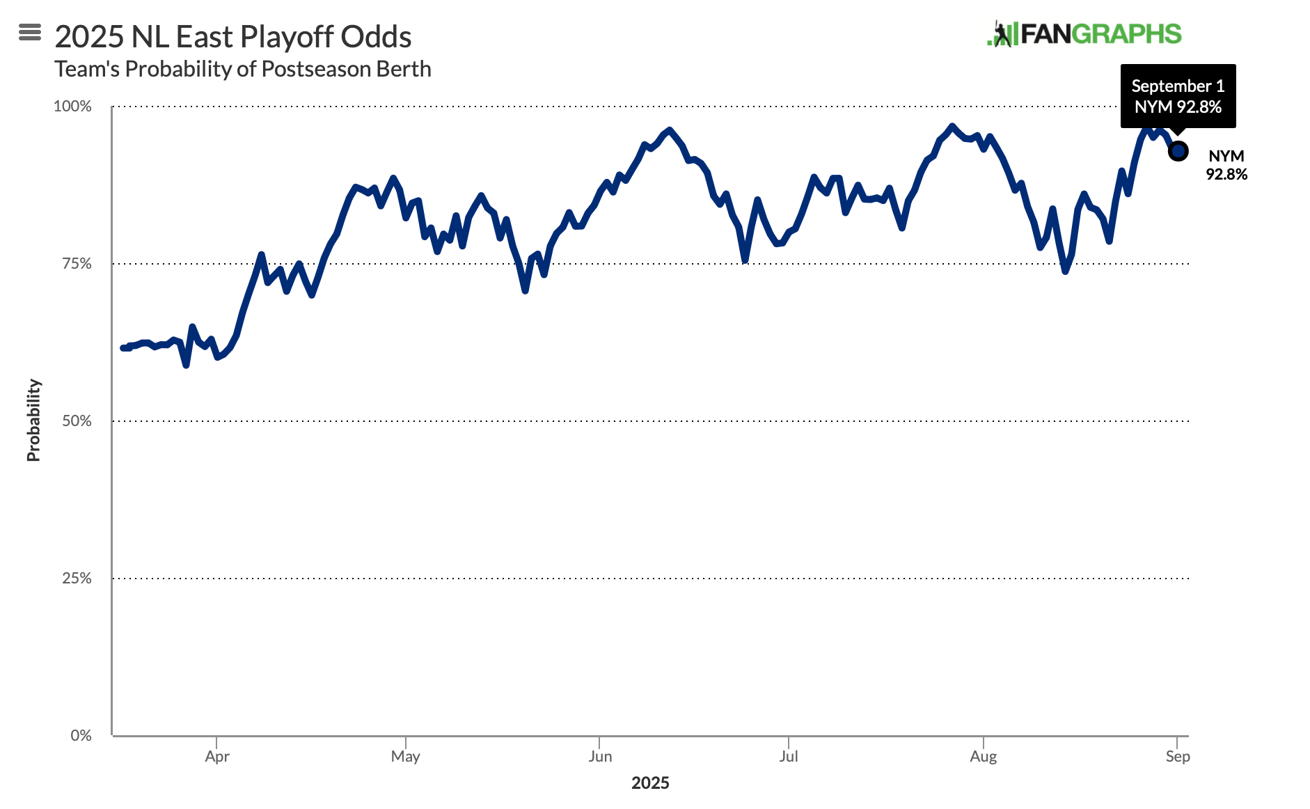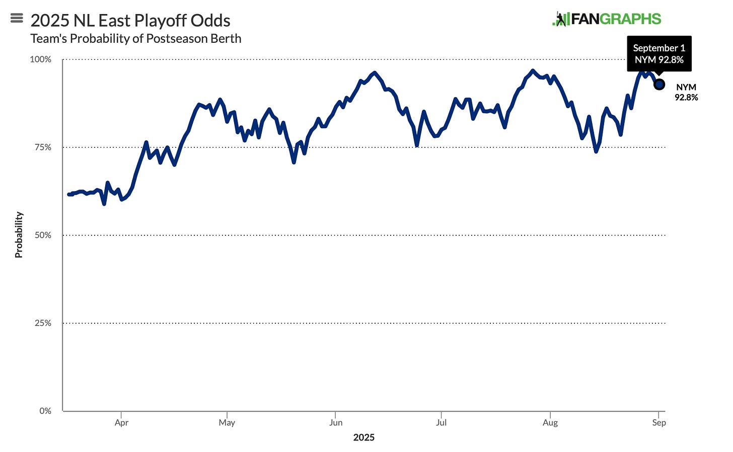 Per Fangraphs, the Mets have a 92.8% chance of qualifying for the playoffs.
