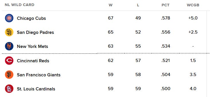 Meanwhile, with the Reds win in Pittsburgh the Mets are now just 1.5 games ahead of Cincinnati for the final wild card spot.