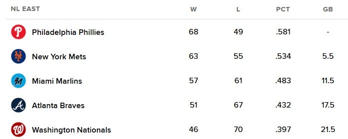The Mets obviously lost again on Sunday while the Phillies won, increasing their lead in the NL East to 5.5 games