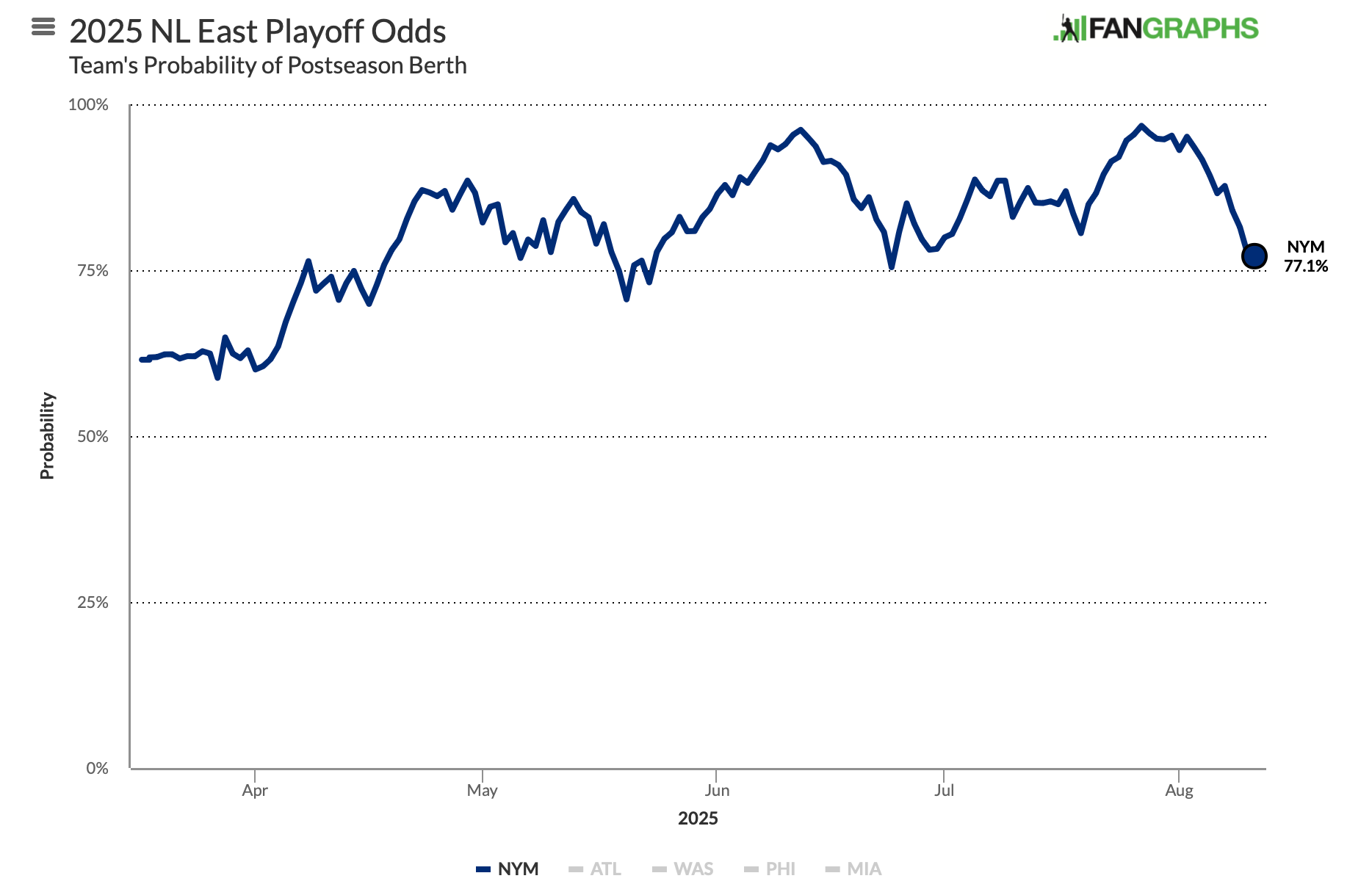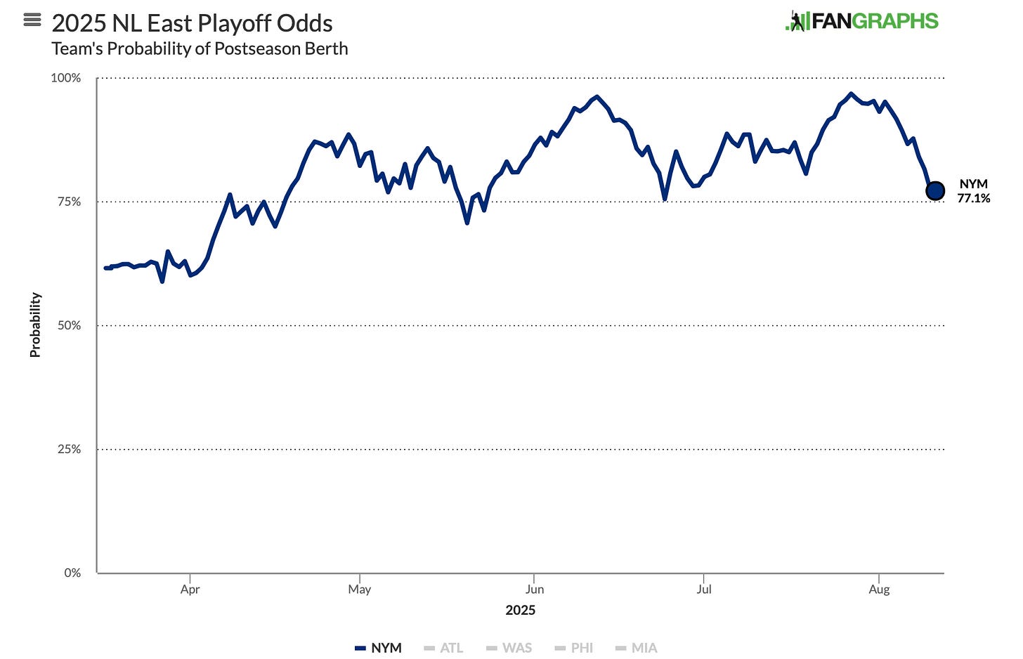 Per FanGraphs, the Mets now have an 77.5% chance of making the playoffs in 2025: