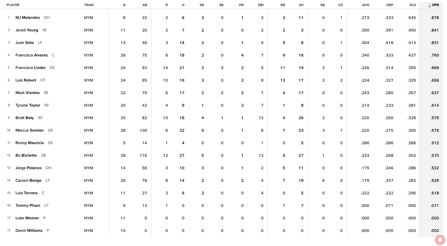 The same can be said for Vientos who, to be fair, has been pretty good at first base defensively in a small sample, but his bat looks a whole lot like it did in 2025 which was not playable - he was only in the majors after May or June because he is out of options.