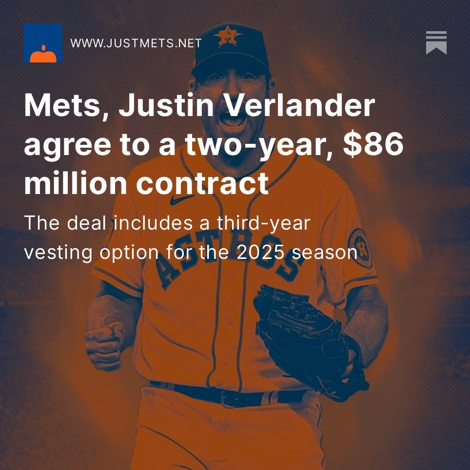 The Mets reportedly signed RHP Justin Verlander to a two-year, $86 million contract with a third year vesting option