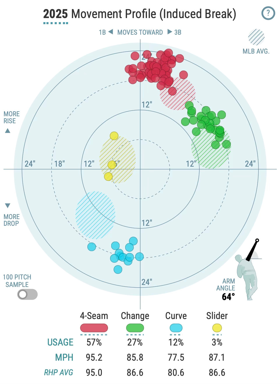 Yamamoto’s cutter averaged +7.5 iVB and 3.8 inches of glove-side break last year, taking a very similar overall path to the plate as Tong’s. Though not identical pitches, looking at these charts side by side gives you an idea of both how subtle the movement on this pitch can be and how many different attack angles can be taken alongside the rest of a developed arsenal.