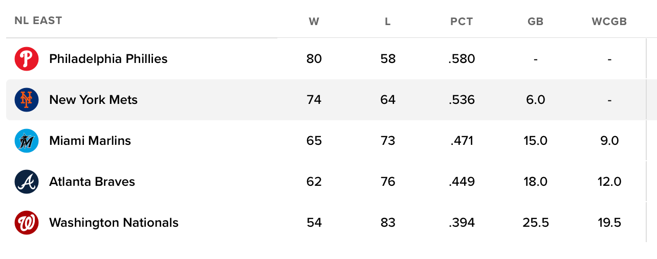 The Mets did not gain any ground on the Phillies on Monday, as the Phillies rallied to beat the Brewers in Milwaukee 10-8. They remain six games behind the Phillies for first place in the National League East, although should they finish in a tie, the Mets would win the NL East by virtue of the fact they won the season series against the Phillies:
