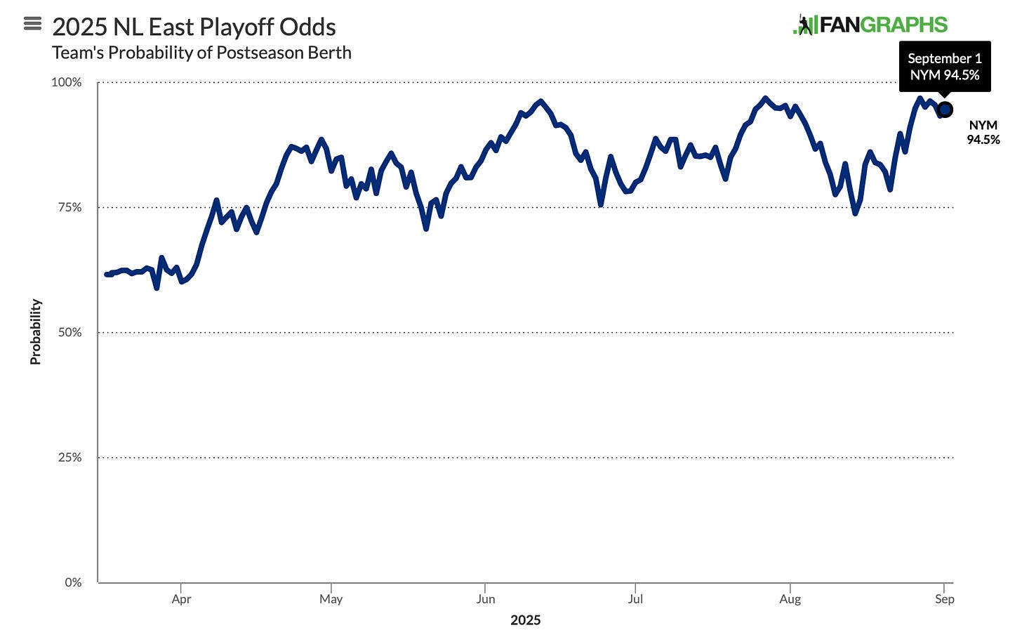 Per Fangraphs, the Mets have a 94.5% chance of qualifying for the playoffs.