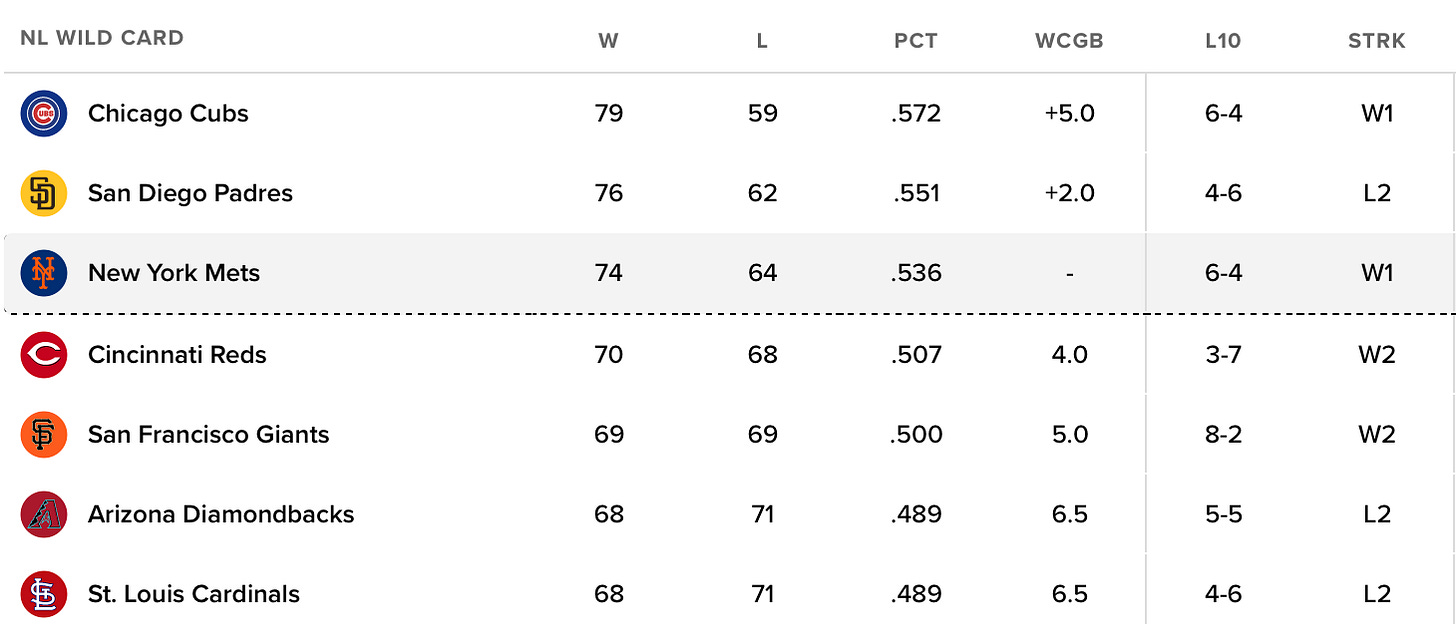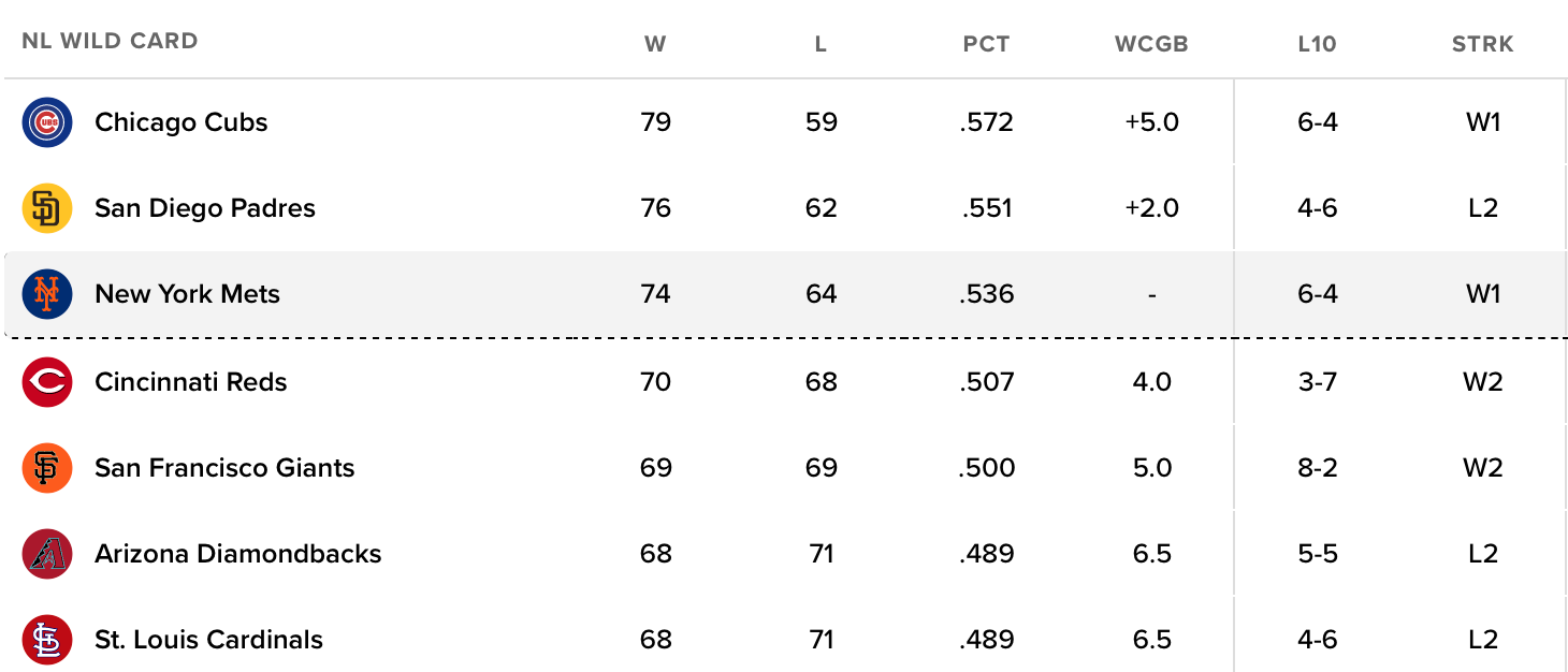 Meanwhile, the Reds rallied to defeat the Blue Jays on Monday, so the Mets did not increase their lead for the third wild card. But the Mets pulled to within two games of the Padres for the second Wild Card and reduced their magic number over the Reds to 21: