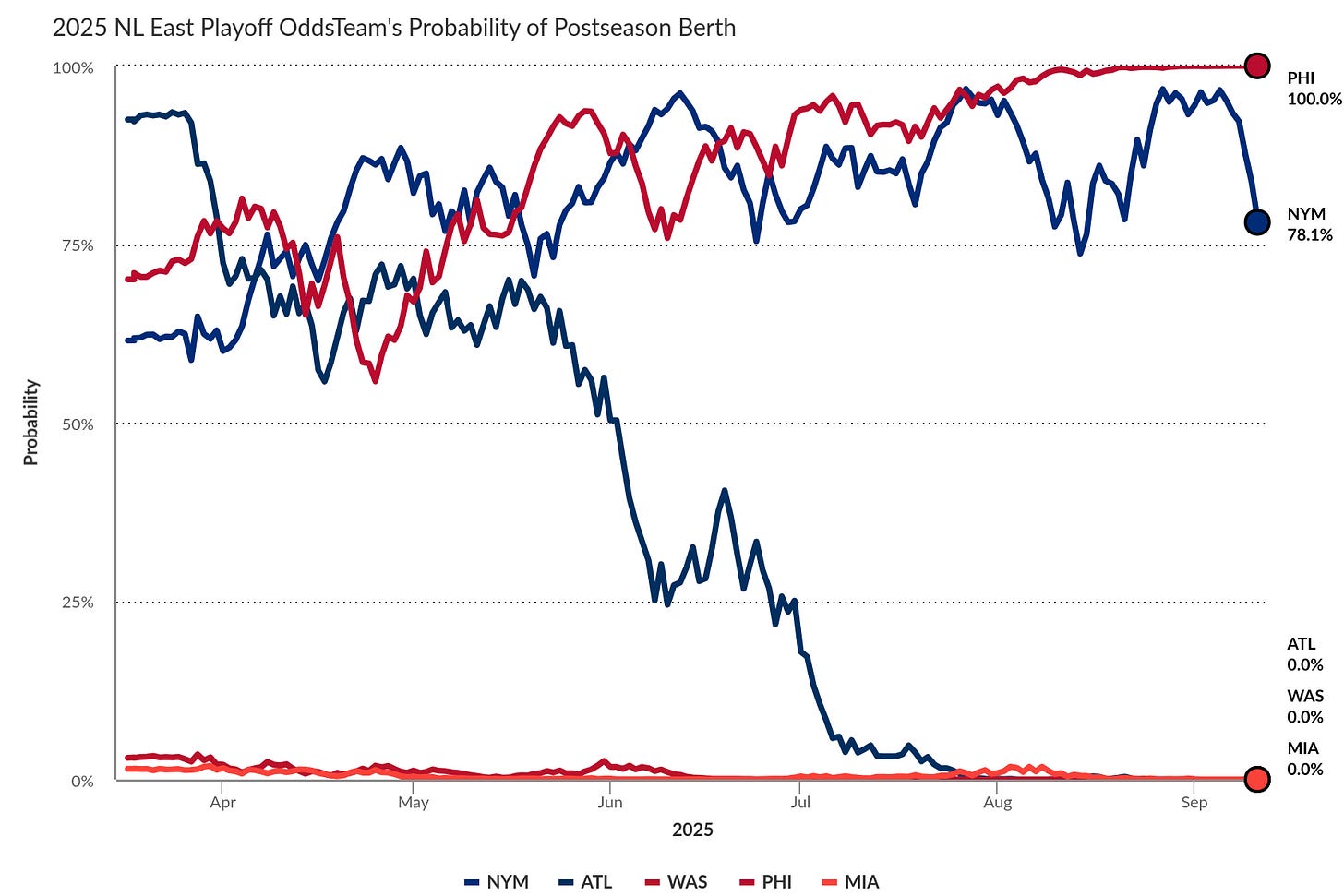 Per Fangraphs, the Mets playoff chances are 78.1% which is down from 83.1% the previous day.