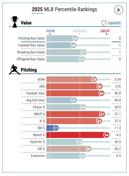 Soto’s average fastball velocity is 97 mph and has held left-handed hitters to a .138 opposing batting average and a .547 OPS.