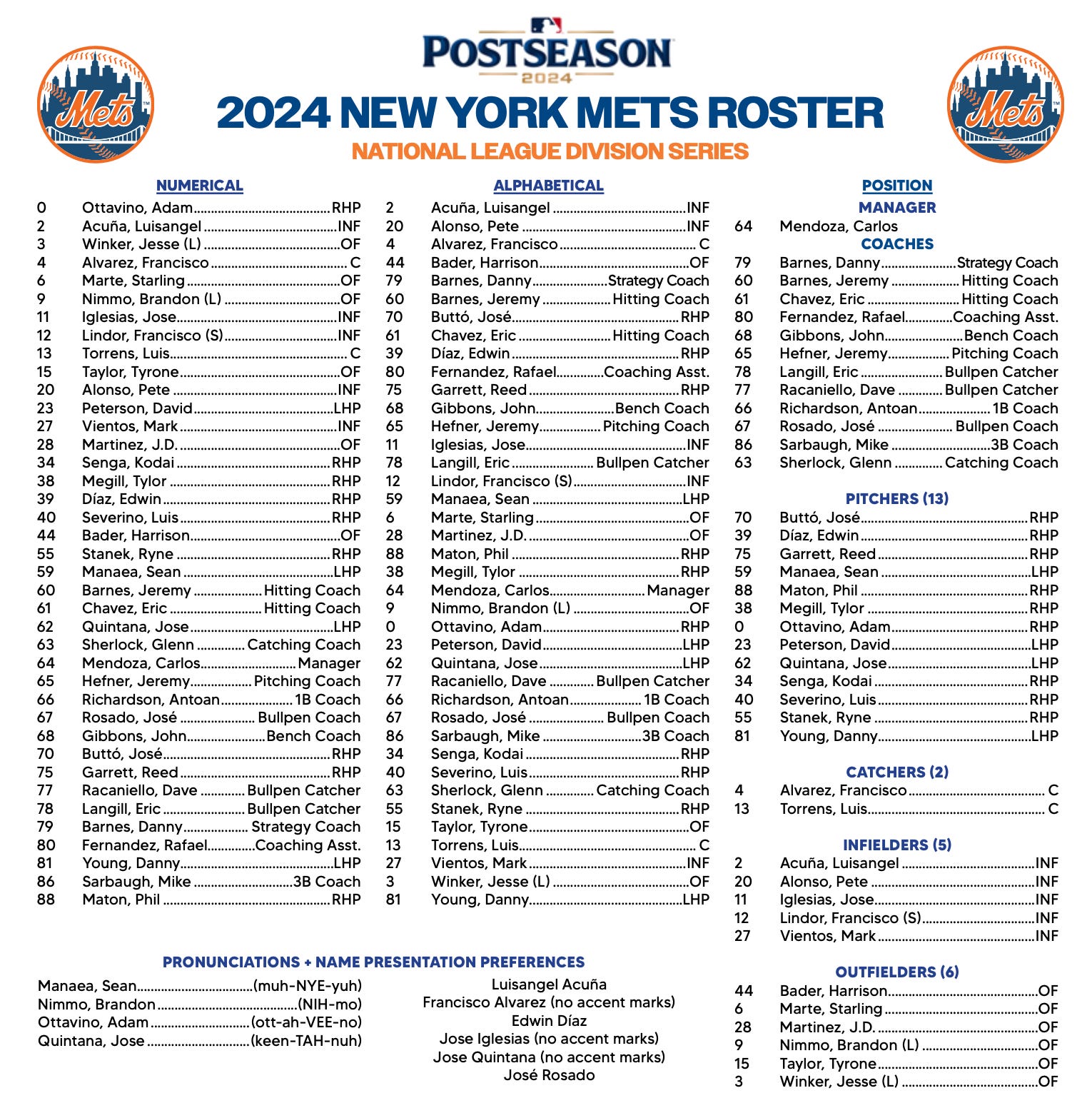 The Mets announced their roster for their Wild Card Series against the Phillies, which begins this afternoon at 4:08 PM ET at Citizens Bank Park in Philadelphia. The game will air on FOX with RHP Kodai Senga facing off against RHP Zack Wheeler.