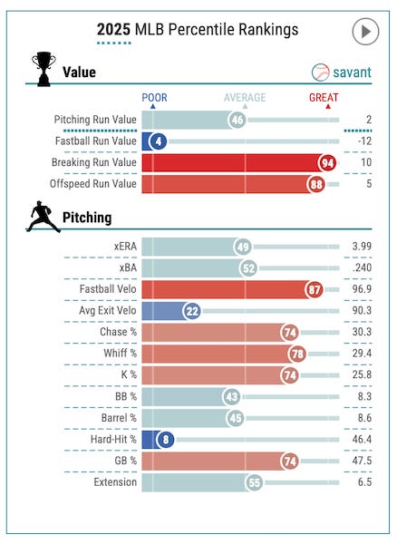 Cabrera turns 28 in April. He’s a hard thrower - his fastball sits in the upper 90s but his best pitches are his curveball and change-up. The key for Cabrera and being able to lean on his strength is his ability to throw strikes and get ahead of hitters. Historically, that has been a problem for him, as he averaged 5.1 walks per nine innings from 2021-2024. But that mark improved to 3.1 walks per nine in 2025, which led to fewer baserunners, more strikeouts, a lot of ground balls, and a lot of chase.