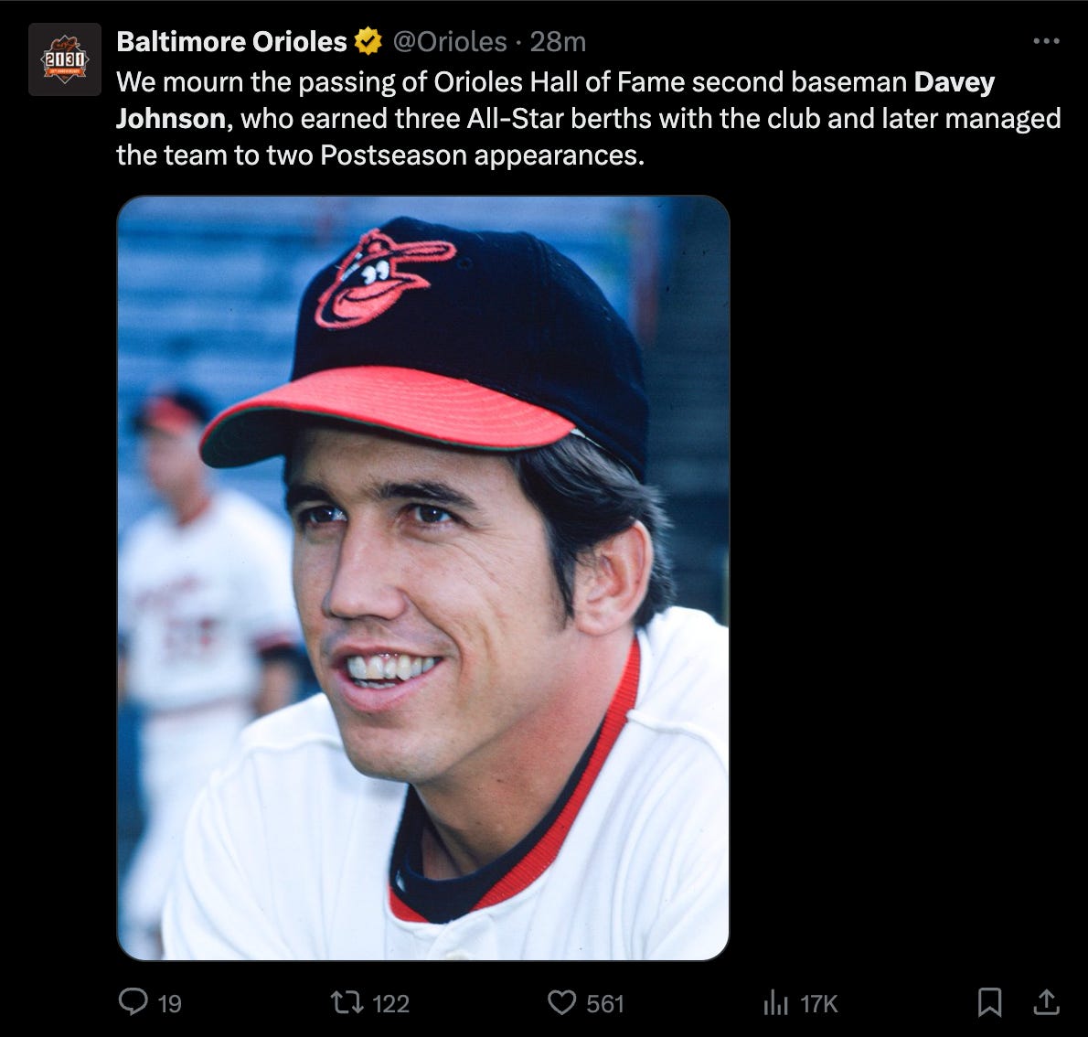 Johnson is a member of the New York Mets and Baltimore Orioles Hall of Fames. He is mourned by his wife Susan, and the rest of the baseball world.