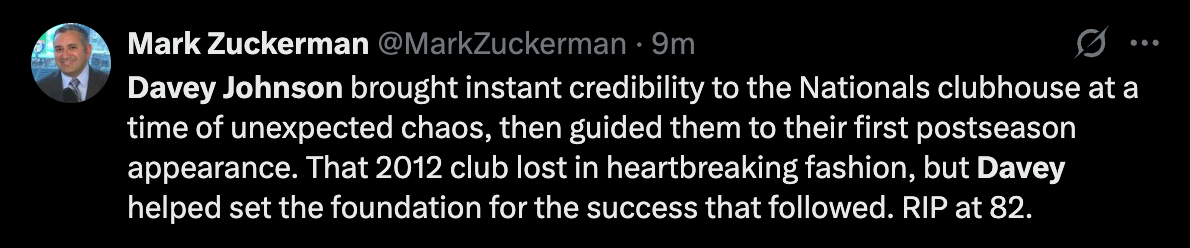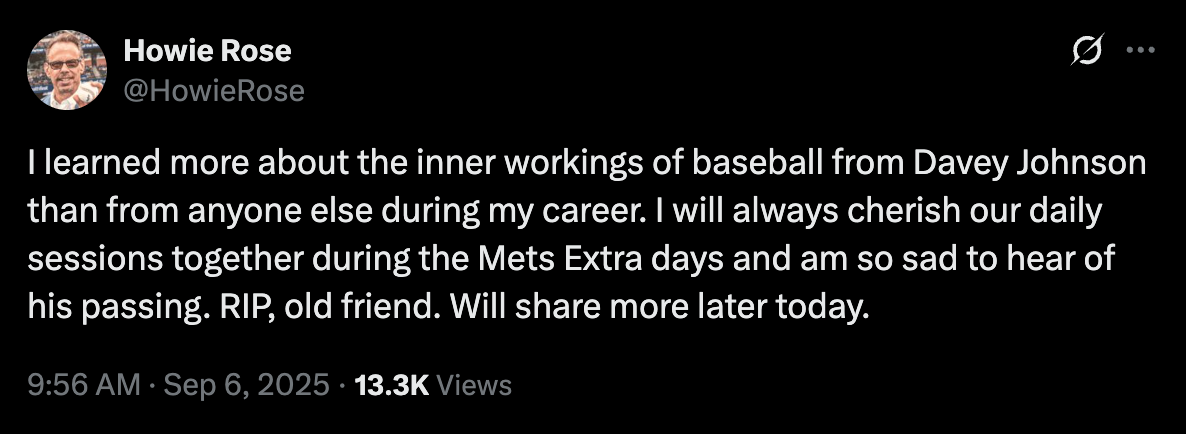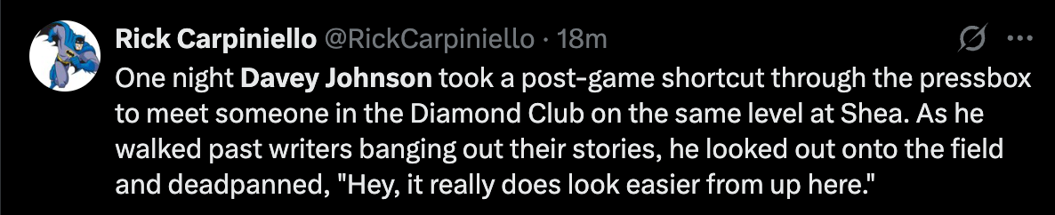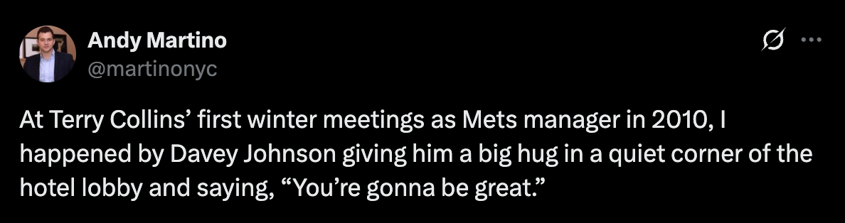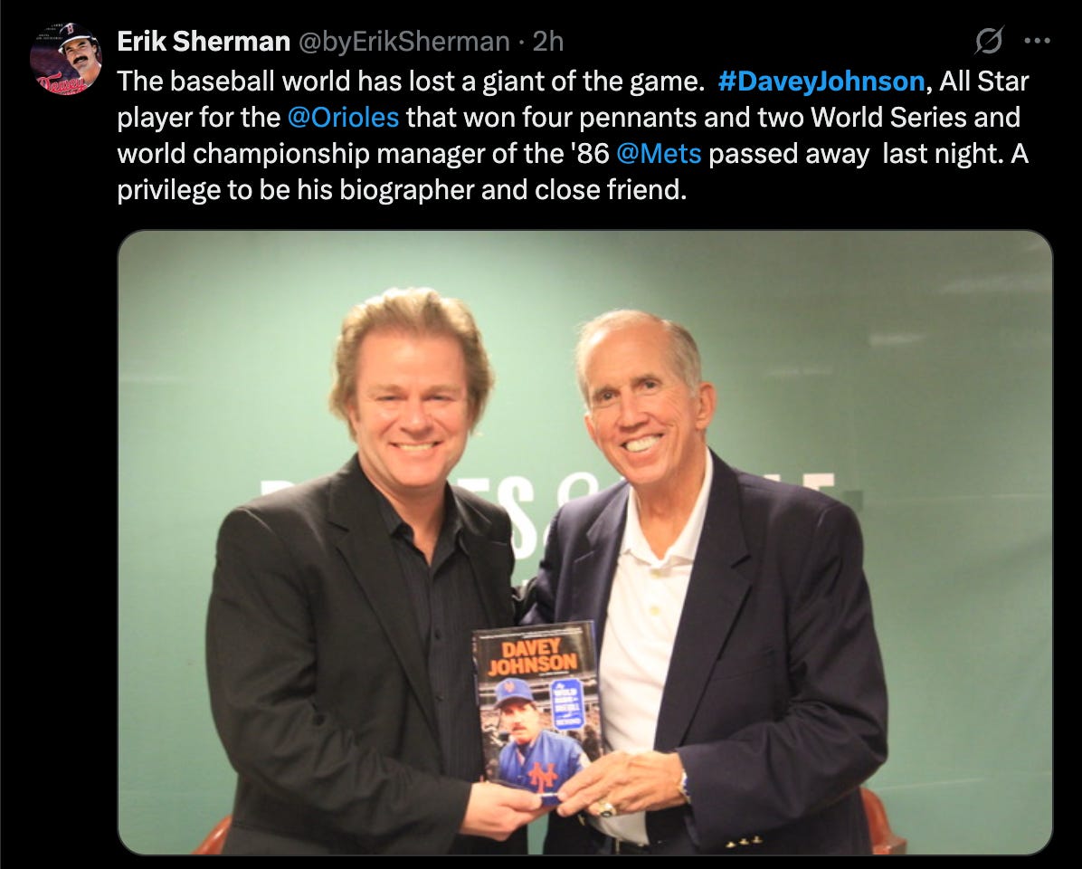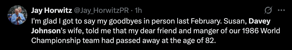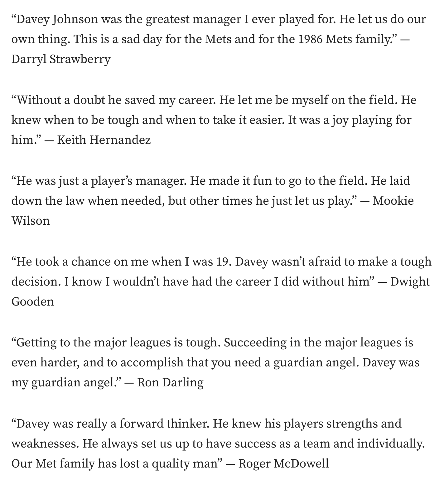 Jay Horwitz, the long-time Mets staffer, wrote a lovely tribute to Davey Johnson early on Saturday morning as the news broke.