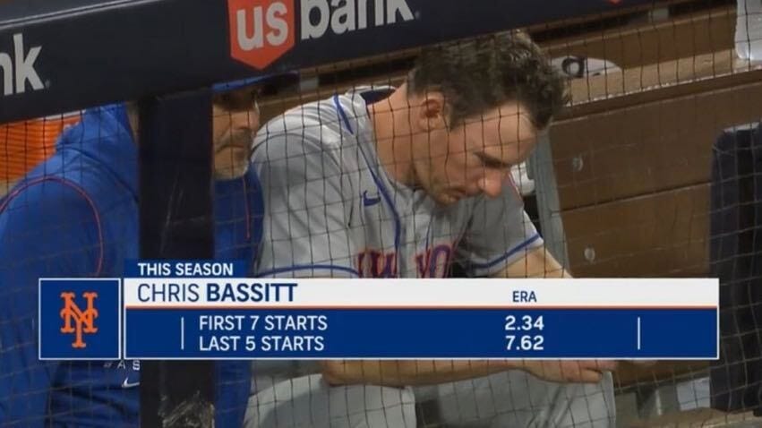 He’s looked out of sync over these last few starts and whether it’s the pressure of going from the club’s number three pitcher to their de facto ace or just a midseason adjustment he needs to make, it has been a real detriment to this club. Even in the starts where he hasn’t been shelled like he was Wednesday night in San Diego, he has not given the Mets much length. In fact, Bassitt has only gotten four outs all season after the sixth inning.
