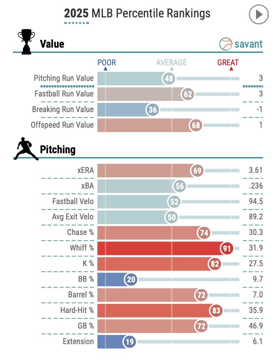 Has Wilson been a bit volatile in the walk department as a result of working pitches so low? Yes, but he’s also been able to steadily improve his K rate, culminating in last year’s 10.6 K/9, his highest mark since 2018. Pair that with the knowledge that his 3.72 BB/9 in 2025 is still one of the lowest marks of his career, and I’d be willing to bet Wilson has indeed tapped into a formula that finally suits his stuff properly.