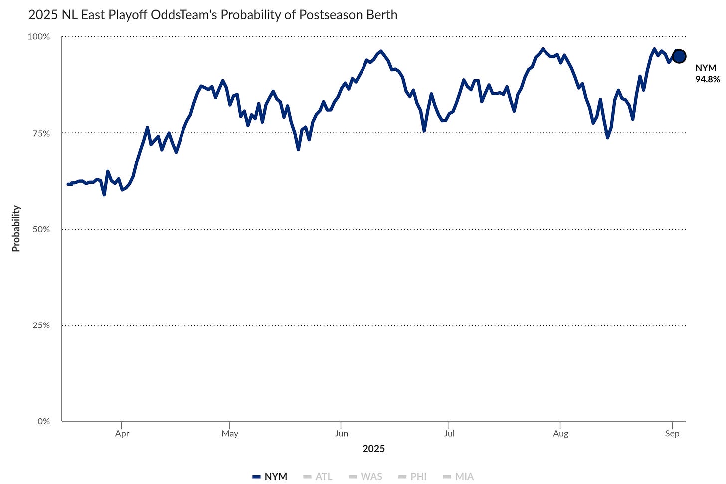 Per FanGraphs, the Mets have a 94.8% chance of making the postseason: