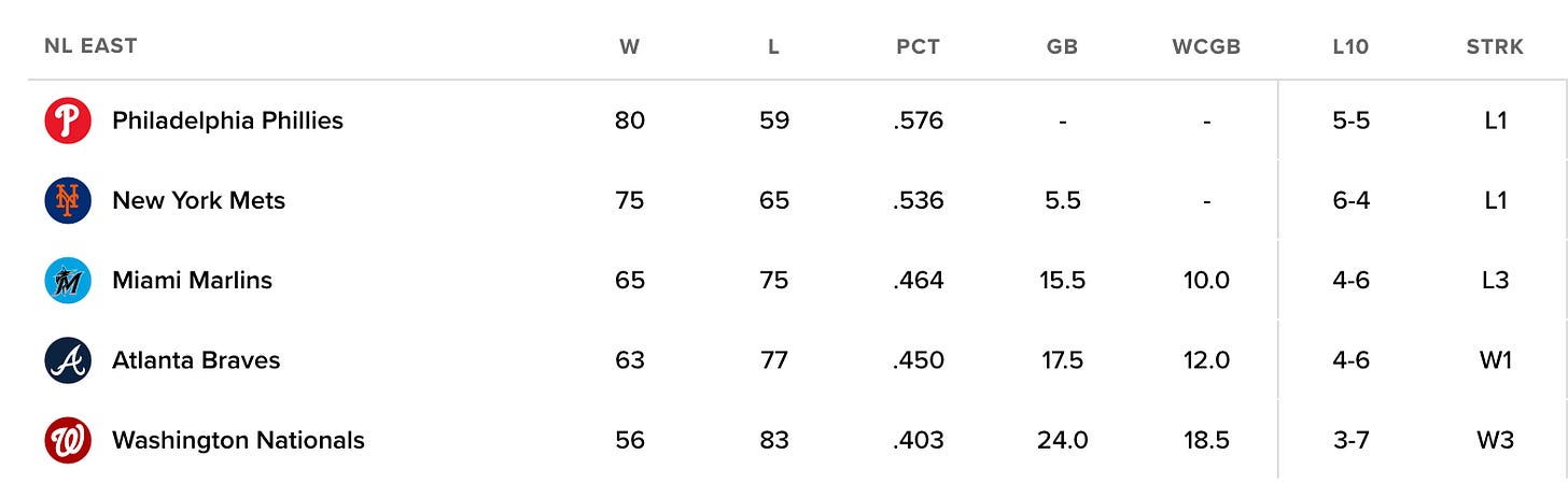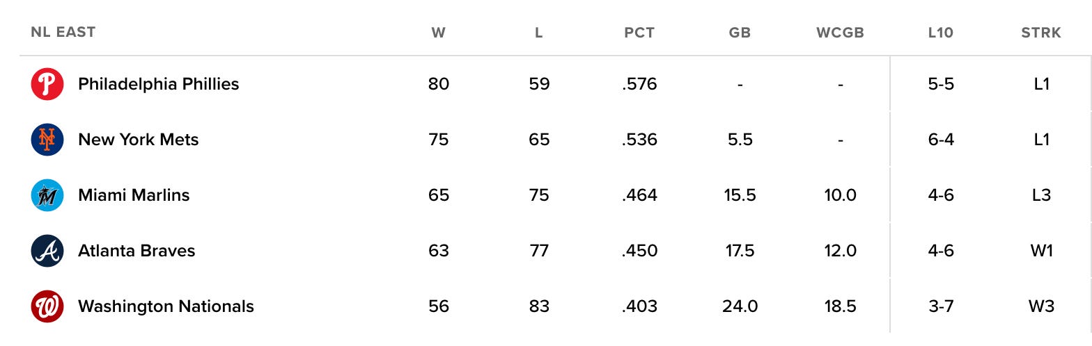 Despite the Phillies also losing on Wednesday, the Mets failed to make up any ground due to their own loss. They are still 5.5 games back of Philadelphia for the NL East lead.