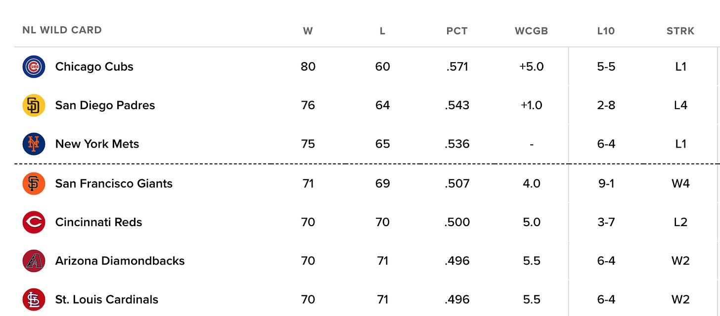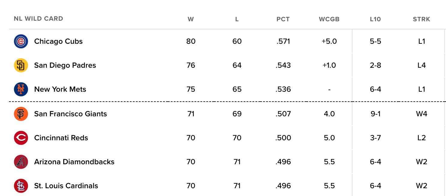 Meanwhile, the Reds lost on Wednesday but the Giants won - again - meaning that the Mets are still five games ahead of Cincinnati, but now only four games ahead of San Francisco for the final Wild Card spot in the National League. But, with the Padres being swept by the Orioles on Wednesday, the Mets remain just one game back of San Diego for the second Wild Card berth.