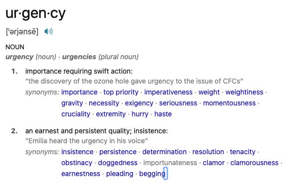 Before I starting writing today’s story, I looked up the word “urgency” in the dictionary.