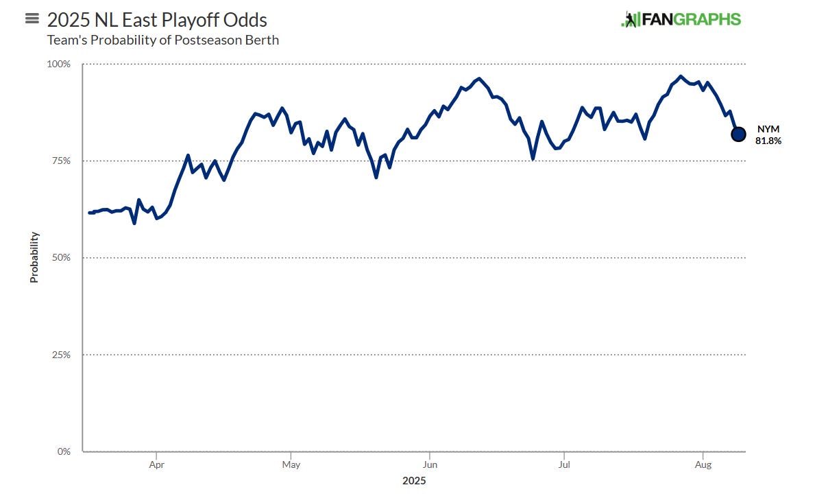 Per FanGraphs, the Mets now have an 81.8% chance of making the playoffs in 2025: