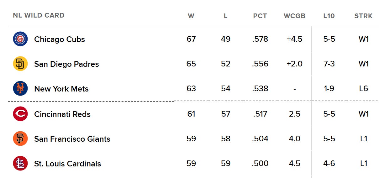 Naturally, the Cubs and Reds also both won on Saturday, further weakening the Mets’ grasp on the final Wild Card spot. New York now sits 4.5 games behind Chicago and maintains just a 2.5-game lead over Cincinnati.