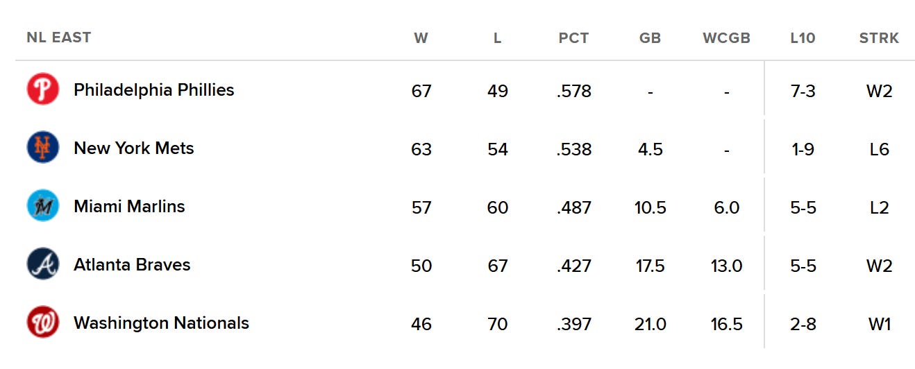 While the Mets lost again, the Phillies won again on Saturday, putting the Mets 4.5 games back from first place in the NL East.