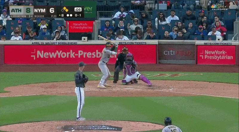 After securing an inning-opening groundout, Weaver surrendered a single to Denzel Clarke. However, he immediately struck out Lawrence Butler, leaving the Mets just one out away from entering the home half of the eighth trailing by a single run with the top of the order due up.